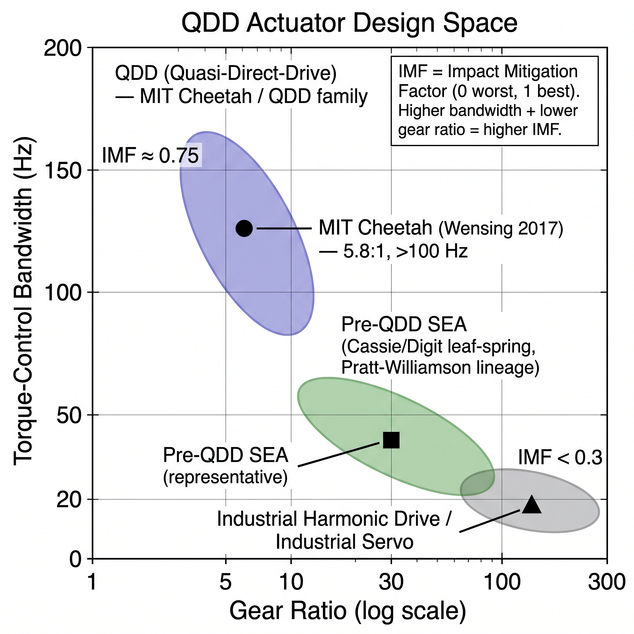 Wensing 2017은 QDD 설계의 표준 참조다. 세 형식 기여. (1) 갭 반경, 기어비, 토크-대역폭 곱을 관련짓는 proprioceptive 액추에이터 설계 프레임워크, (2) 낮은 기어비에서 모터 전류가 load-side 토크 센서를 대체할 만큼 충실한 토크 추정기라는 증명, (3) 액추에이터가 충돌 전이를 얼마나 잘 흡수하는지의 정규화된 지표로서 Impact Mitigation Factor (IMF) 의 도입. MIT Cheetah에서의 검증은 약 85 ms의 접촉 시간, 450 N 이상의 발 최고 힘, 전형적 산업 서보의 약 2.8× 토크 밀도를 보고한다 [3]. 이 논문의 설계 원리는 이후 12개 이상의 상용·학술 플랫폼에 걸쳐 재현되었다.