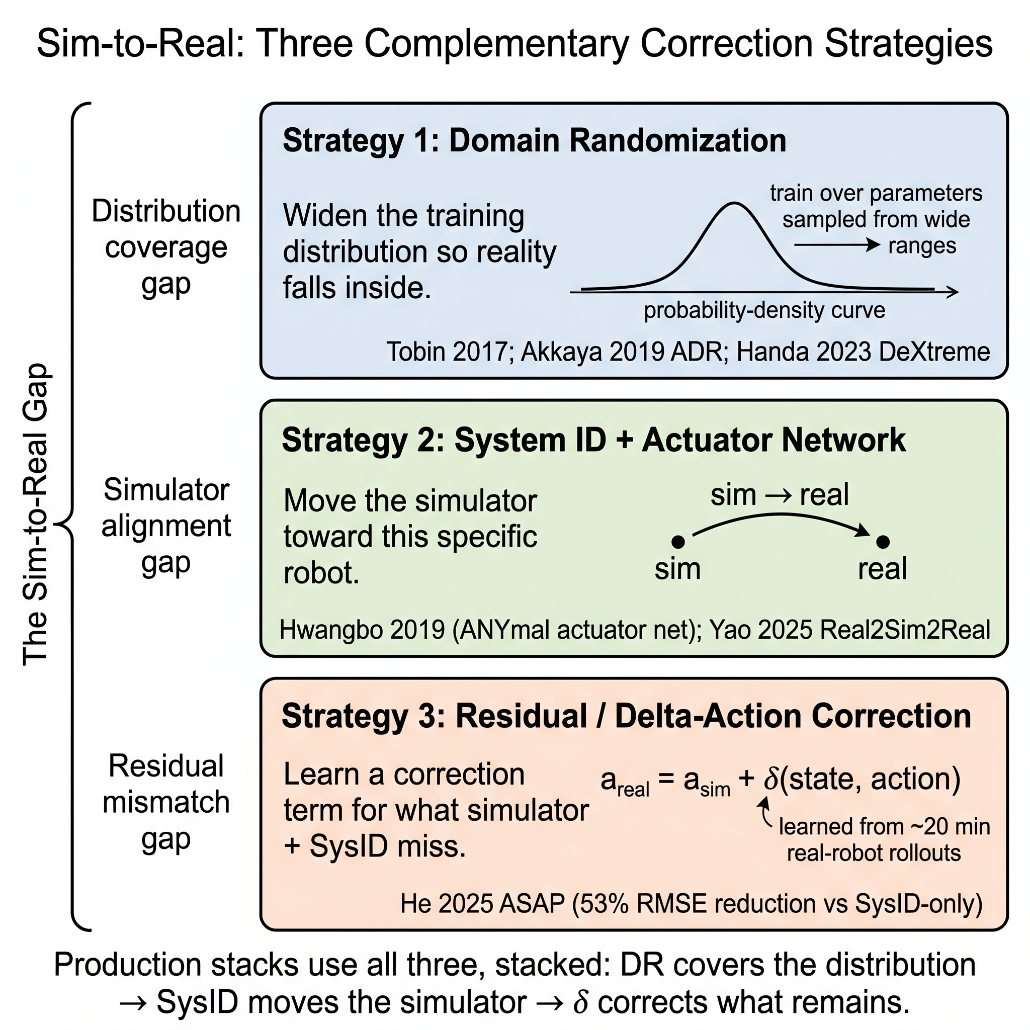 기폭제 4 판결: 부분 해결됨. 세 전략이 공존하고 쌓인다. 보행에 대해 문제는 닫혔다. GPU 병렬 규모에서의 도메인 랜덤화가 시뮬 가능 분포에 걸쳐 robust한 정책을 생산하고, 액추에이터 네트워크를 갖는 시스템 식별이 각 embodiment에 대해 시뮬레이터를 정렬하며, delta-action 잔차 보정(ASAP)이 마지막 몇 퍼센트를 다룬다. Seo 외의 15분 sim-to-real 보행 결과 [15]가 닫힘을 예시한다 — 보행에 대해 sim-to-real은 이제 15분 엔지니어링 과제이지 연구 문제가 아니다.