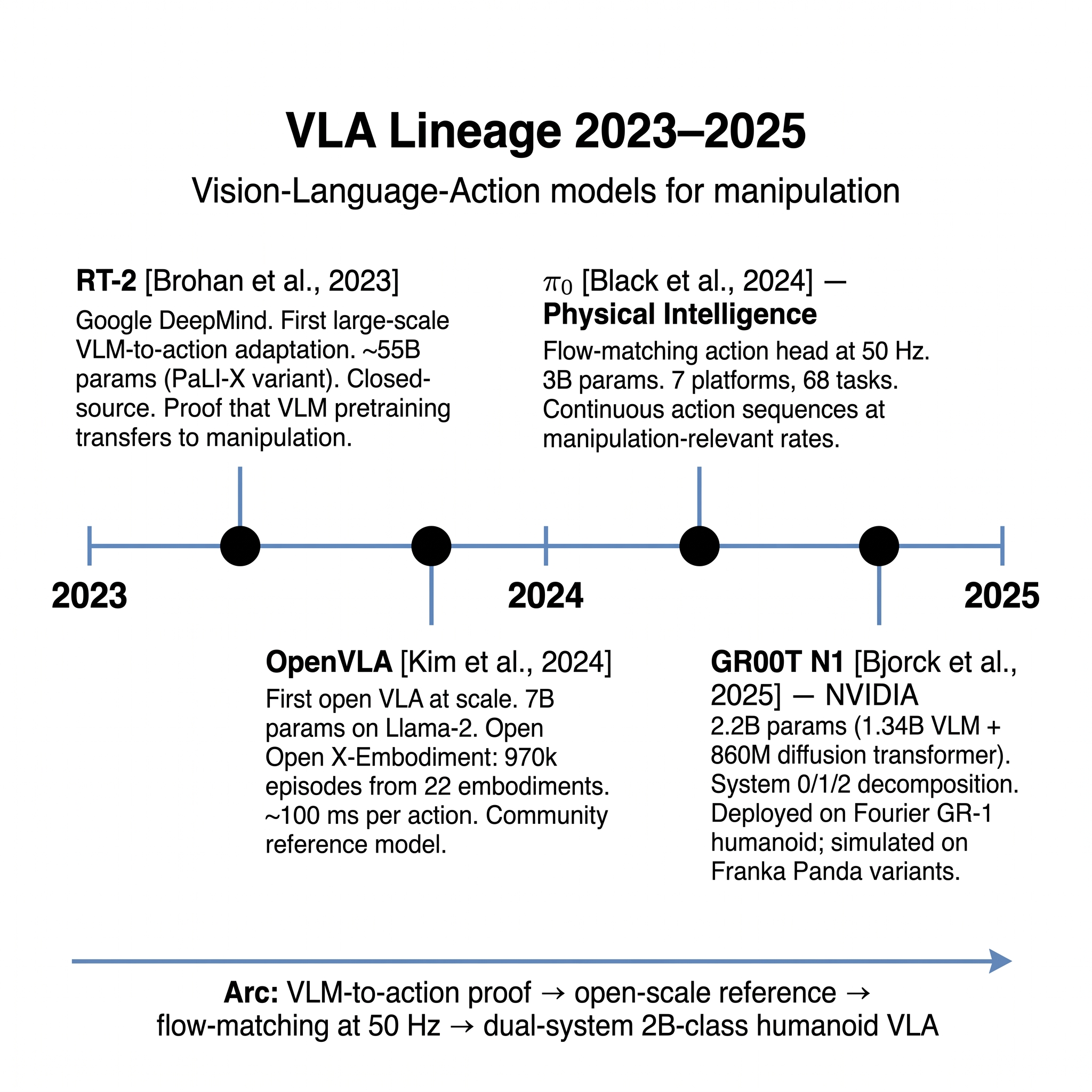 RT-2 → OpenVLA → π0 → GR00T N1 순서가 오픈 및 반오픈 VLA 계보를 정의한다. 폐쇄 소스 프로덕션 VLA — Figure Helix와 AgiBot GO-1/GO-2 — 는 이 계보와 나란히 앉고 다른 방식으로 프런티어를 차지한다(§10.4).